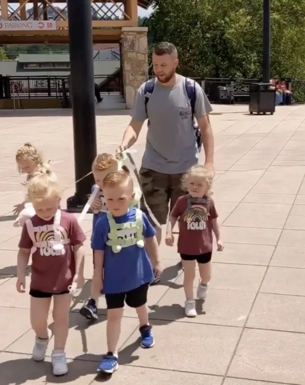 - Vijfling en de Uitdagingen: Jordan Driskell, een vader van vijf, gebruikt kinderriemen om zijn jonge kinderen in het openbaar veilig te houden.