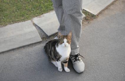 Het langs de benen lopen is een rustige manier van contact maken. Soms geeft een kat eerst een kleine kopstoot. Daarna loopt hij nog een rondje om de persoon heen.