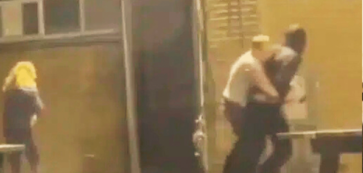 De situatie speelt zich af in een levendige omgeving waar meerdere mensen aanwezig zijn. In de eerste seconden lijkt het vooral een ongemakkelijke ontmoeting, maar de sfeer verandert wanneer de man dicht bij haar blijft staan.