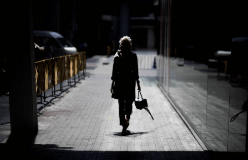De vrouw lijkt daarvan te schrikken en probeert rustig wat afstand te nemen. Ze draagt een tas over haar schouder en blijft in beweging, terwijl de man haar iets lijkt toe te zeggen.
