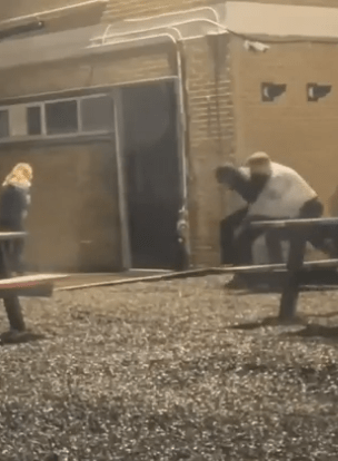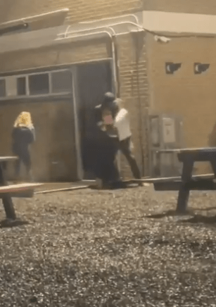 Op de beelden is te zien dat het moment snel voorbij is zodra anderen zich ermee bemoeien. De vrouw loopt zelfstandig verder en de man blijft achter op de stoep.
