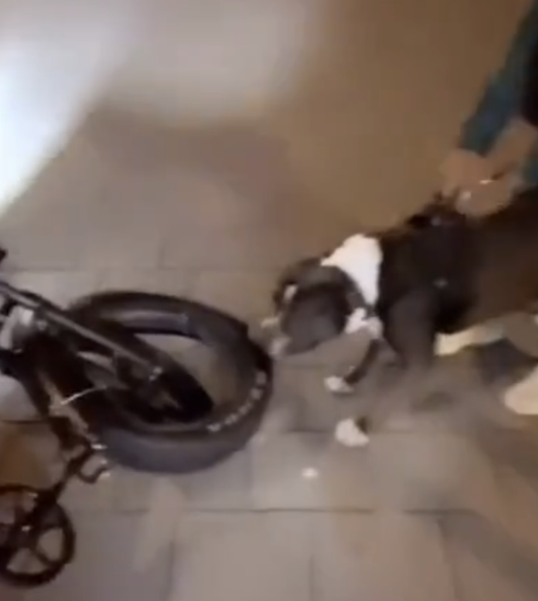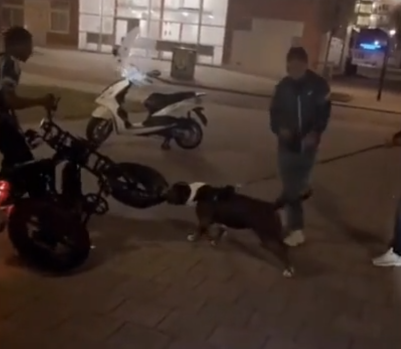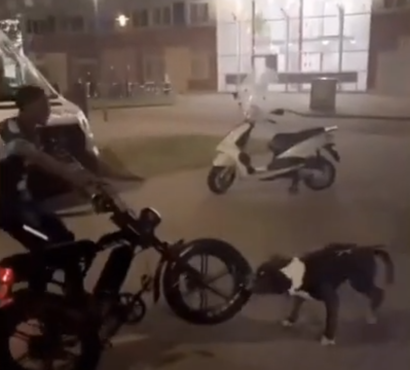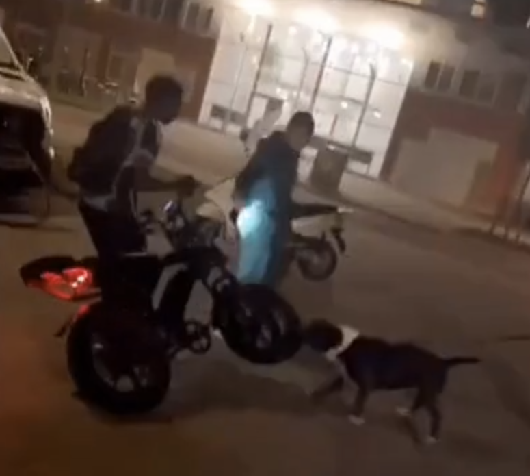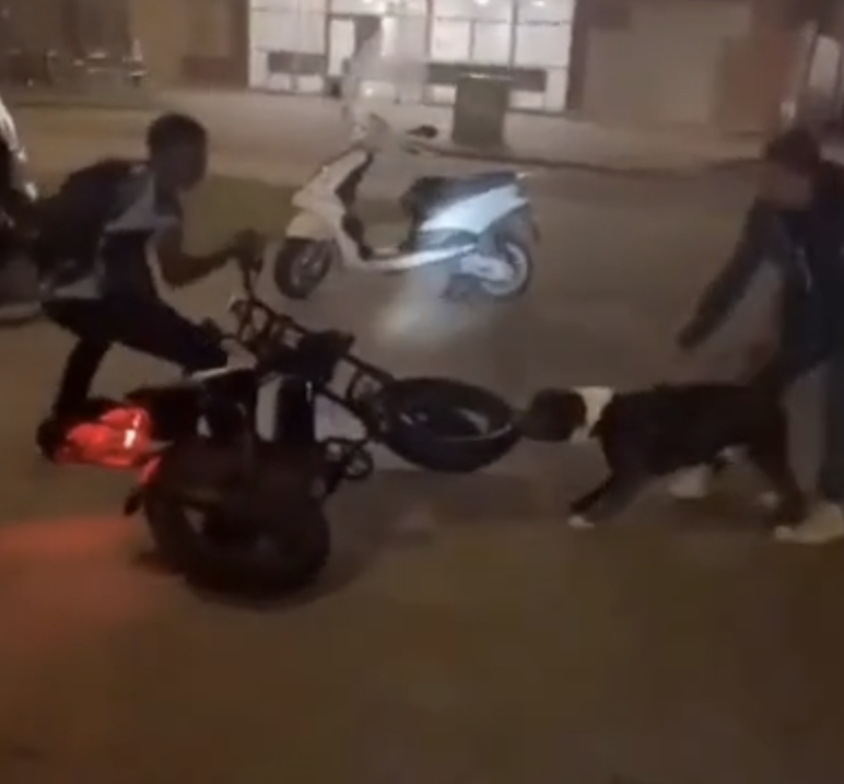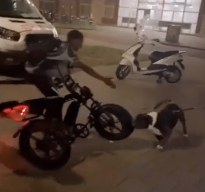 DEEL NU: BEELDEN | Pitbull raakt geïrriteerd door de hangjongeren op fatbikes en begint luid te schreeuwen terwijl hij met gebaren naar voorbijgaande tieners wijst.