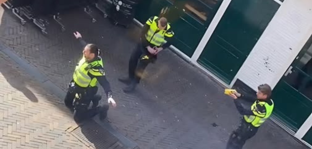 Omstanders zien met verbazing en ontzetting het schokkende tafereel midden in het drukke stadscentrum, op klaarlichte dag. De video is van dichtbij opgenomen, waardoor elk detail van het tragische moment haarscherp in beeld komt en de kijkers een extra persoonlijk en intens gevoel geeft.