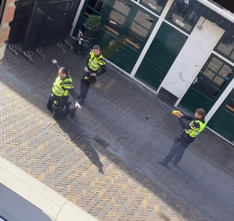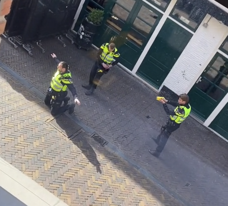 Twee agenten, met hun taser gericht op een collega die rustig met zijn handen in de lucht blijft staan, creëren een sfeer van professionaliteit en volledige controle waarbij niet wordt gelachen.