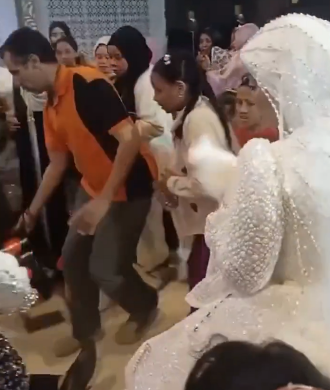 Voor velen voelde het als een onwerkelijk moment, omdat alles zo plotseling gebeurde. De bruid keek vol angst toe terwijl familieleden probeerden kalm te blijven en steun boden te midden van de spanning.
