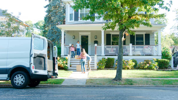Kinderen helpen hun ouders door te assisteren bij het uitladen van dozen uit de bestelwagen op de dag dat ze verhuizen.