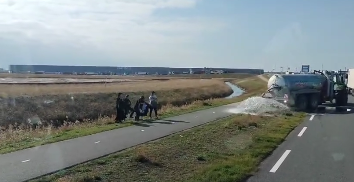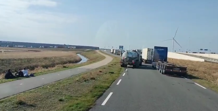Tientallen vrachtwagens stonden tijdelijk stil door een onverwachte vertraging op de snelweg, maar ondanks de frustratie bleven de meeste chauffeurs opvallend rustig, vriendelijk en geduldig wachten tot het verkeer weer op gang kwam.