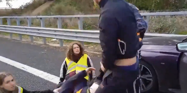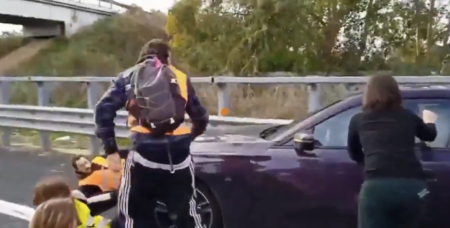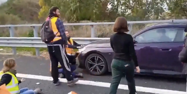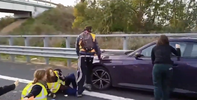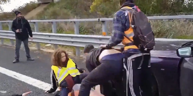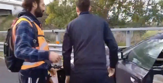 DEEL NU: BEKIJK | De man greep stevig de klimaatactivisten vast terwijl hij zich een weg baande door de menigte om zijn zwangere vrouw veilig te bereiken.