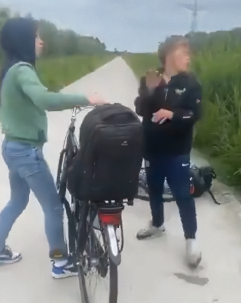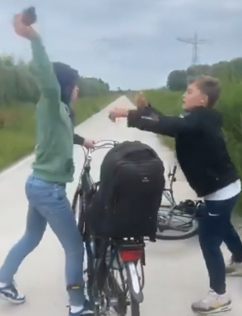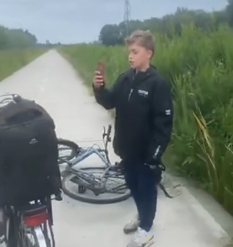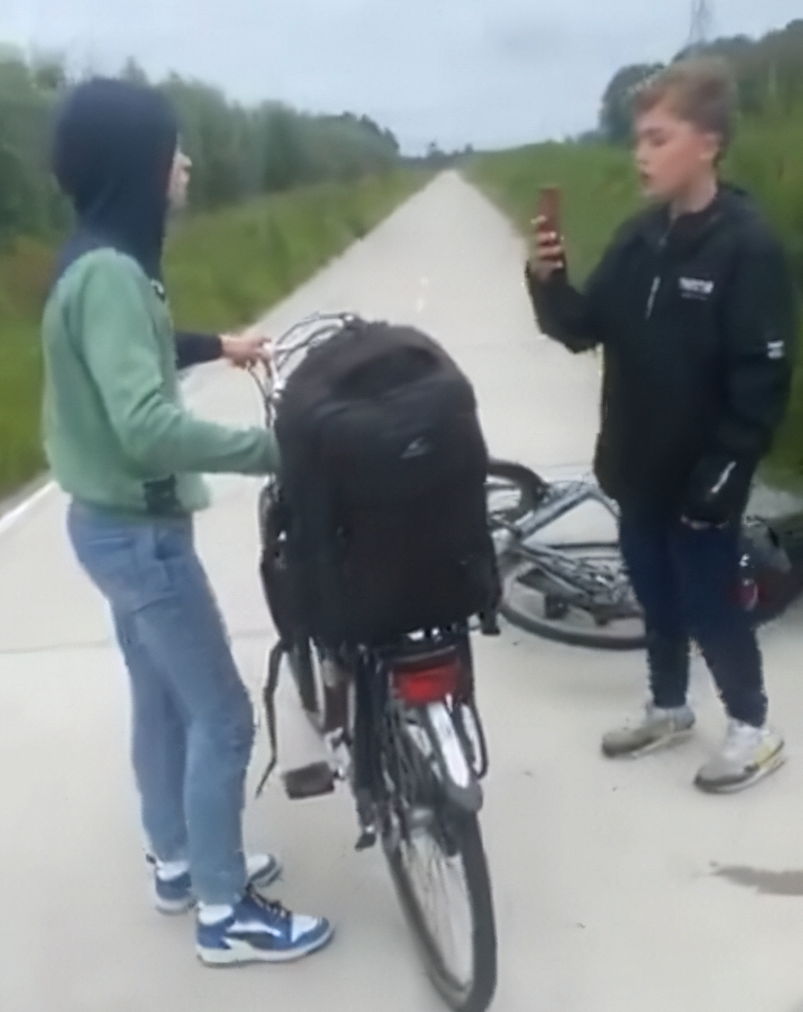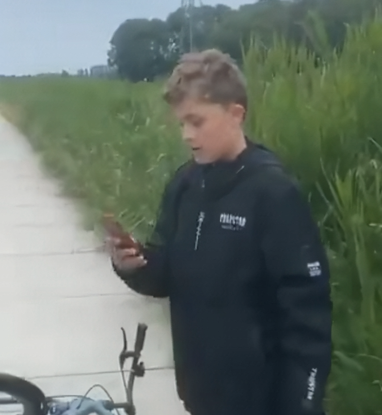 Een jongen liep trots en zelfverzekerd over het plein met zijn telefoon in de hand. Hij vond het grappig om iemand te filmen, maar besefte al snel dat niet iedereen daar blij mee was. De groep om hem heen keek nieuwsgierig toe, onzeker over hoe ze moesten reageren.