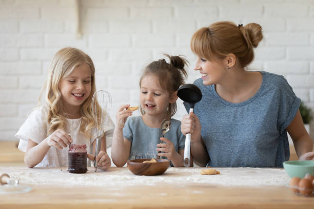Gelukkige millennialmoeder en haar twee schattige dochters genoten van zelfgemaakt gebak met jam, terwijl ze samen de zoete lekkernijen proefden en lachten om elkaars kleine ongemakken en trots.