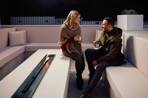 Een gelukkig stel zat samen thee te drinken, de warme damp die opstijgt uit hun kopjes vulde de kamer met een rustgevende geur, terwijl ze ontspannen bij de knapperende open haard zaten en genoten van elkaars gezelschap, in stille en warme communicatie.