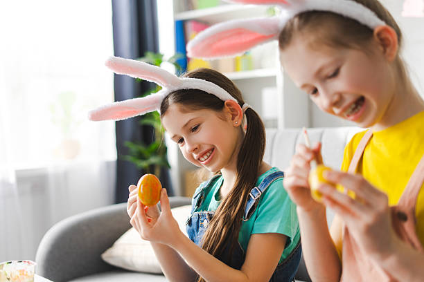 Twee vrolijke zussen met haarbanden met konijnenoren schilderen kleurrijke paaseieren terwijl ze gezellig samen op de bank in hun sfeervolle woonkamer zitten en de paasvreugde delen. Hobbyconcept.