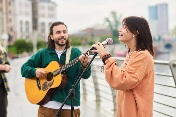 Aan de overkant van het plein stond een jonge vrouw te zingen, haar ogen gesloten en een zachte glimlach op haar gezicht. Haar stem vulde de avondlucht met warmte en emotie. Ze droeg een eenvoudige jurk en leek volledig op te gaan in haar muziek, alsof ze één werd met de melodie.