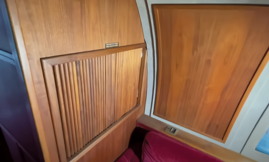 Binnen in de cabine werd de luxe nog duidelijker door de prachtige bekleding van de stoelen met zacht rood fluweel, dat niet alleen het comfort versterkte maar ook een gevoel van weelde en elegantie gaf aan de passagiers die plaatsnamen in deze weelderige en smaakvolle ruimte, waardoor een gevoel van exclusiviteit en verfijning werd gecreëerd dat de reiservaring nog meer bijzonder maakte.