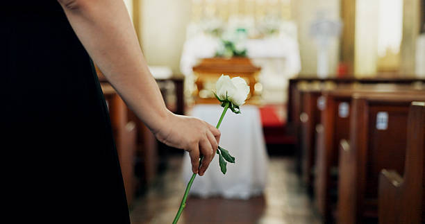 Funeral, hand or person with flower in church for farewell service, mourning death and respect. Ceremony, goodbye or grieving with sorrow, honor or rose in cathedral for burial, loss and memorial