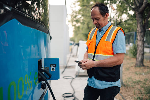 Bus driver engaging with a smartphone while charging an electric bus at a modern charging station, promoting sustainable transportation solutions