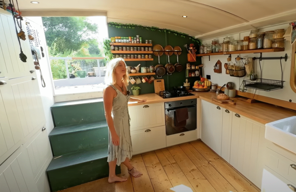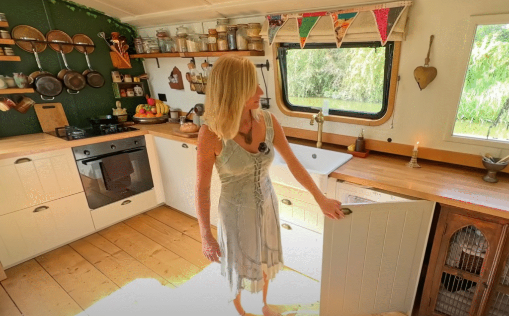 Jen’s boot is slim ontworpen en praktisch ingericht. In haar moderne keuken bereidt ze smaakvolle gerechten met verse groenten die ze oogst uit haar eigen drijvende tuin op het dek.