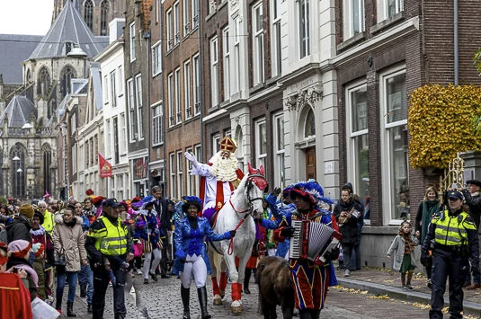 Arrival of Sinterklaas in the city of Kampen. The old Saint is riding his horse through the crowded shopping street surrounded by his helpers the Black Petes. Sinterklaas is a traditional Dutch holiday for children that is celebrated on the 5th of December. In recent year there is a strong discussion about the role of Zwarte Piet in this culutural tradition.