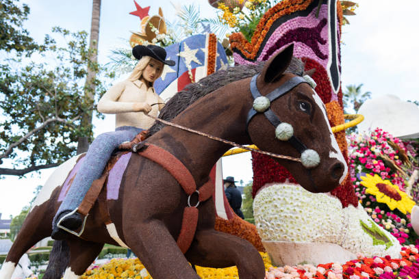 Pasadena Rose Parade float with a cowgirl riding a horse made of flowers.