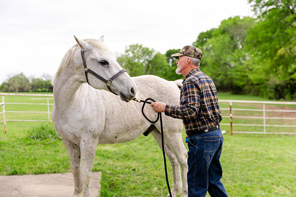 Older man gently handles a horse outdoors. Peaceful rural scene.