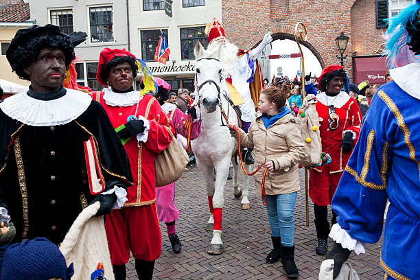 Zaltbommel, the Netherlands – November 16, 2013: The arrival of Sinterklaas in the city of Zaltbommel. Sinterklaas and Zwarte Pieten walking in the streets of Zaltbommel. On the picture Sinterklaas on his horse has just arrived by boat from Spain, together with his helpers called Black Petes. Sinterklaas is a winter holiday figure, it’s believed that Sinterklaas brings children presents in the evening of the fifth of December. The arrival of Sinterklaas is always somewhere mid november and also celebrated in many places throughout the country.
