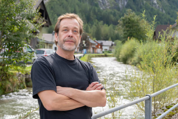 Een oudere, zelfverzekerde man van 50-55 jaar poseert bij een stromende rivier, omringd door groen en oude huizen in een bergdorp op een zonnige dag.