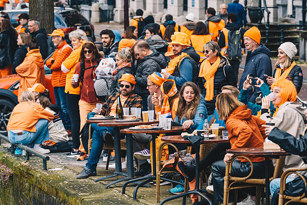 Amsterdam, Nederland – 27 april 2024 – Feestelijke straattaferelen tijdens Koningsdag in Amsterdam, met in oranje gestoken mensen die genieten van muziek, boten, markten en stedelijke festiviteiten in het stadscentrum.