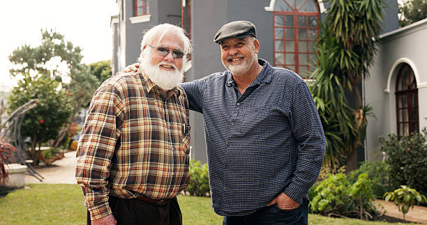 Oude man, vrienden en knuffels buiten met een portret, glimlach en verbondenheid in een bejaardentehuis. Ouderen, gelukkig en samen, omhelzen elkaar in de tuin met trots, hereniging en steun op het gazon.