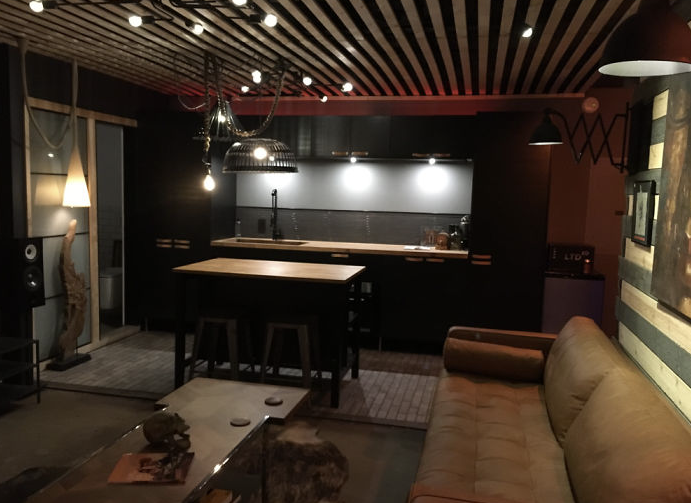 De metalen wanden bleven deels zichtbaar, wat het geheel een stoer en karaktervol uiterlijk geeft.