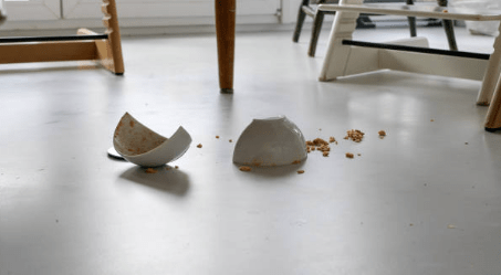 Toen hij opstond, gleed de kom uit zijn hand en spatte met een harde knal uiteen op de vloer, waarbij de warme soep in brede plassen over de tegels liep, overal tegelijk.