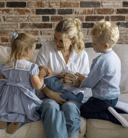 Haar oudere kinderen kijken nieuwsgierig en betrokken. Dit laat zien hoe hecht het gezin is en hoe belangrijk deze momenten voor haar zijn.