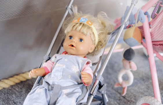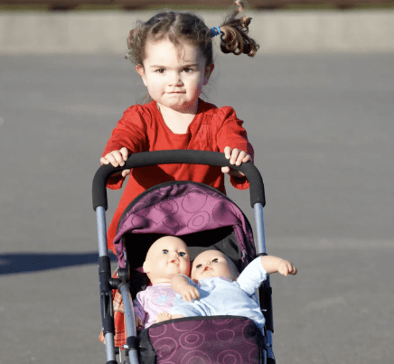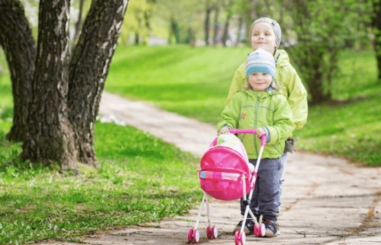 Op de foto hebben de kinderen poppenwagens bij zich. Het speelgoed is eenvoudig en duidelijk. Er zijn geen knoppen, geen lichtjes en geen geluiden.