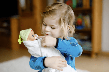 Een pop kan bijvoorbeeld een baby voorstellen. Een wandeling over de stoep verandert zo in een avontuur vol verhalen.