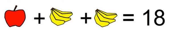 De tweede rij introduceert een nieuwe variabele in de vorm van trossen bananen, die, samen met een appel, optellen tot 18.
