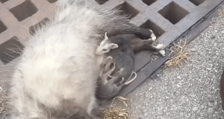 Rond het dier zaten meerdere baby-opossums die zich stevig vastklampten. Dat gedrag is heel normaal bij jonge opossums in hun eerste levensfase.