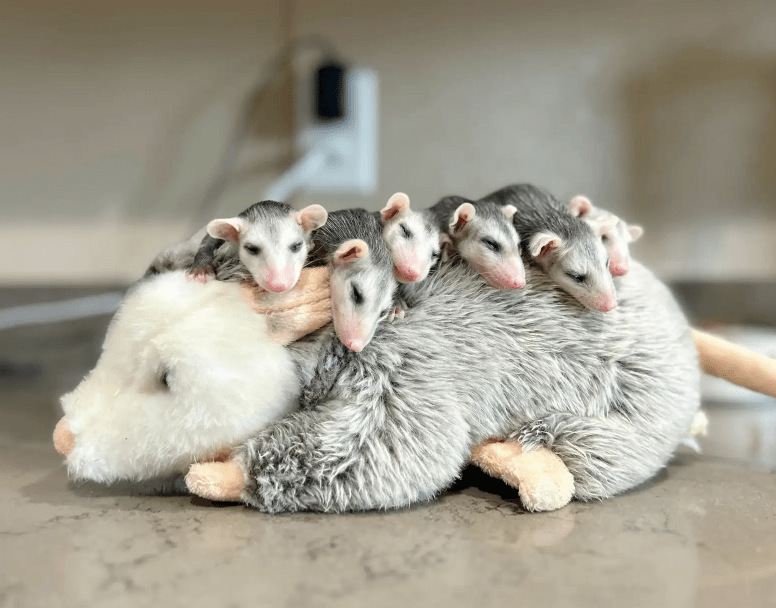 De jonge opossums voelden zich al snel op hun gemak. Ze kropen dicht tegen de zachte knuffel aan.