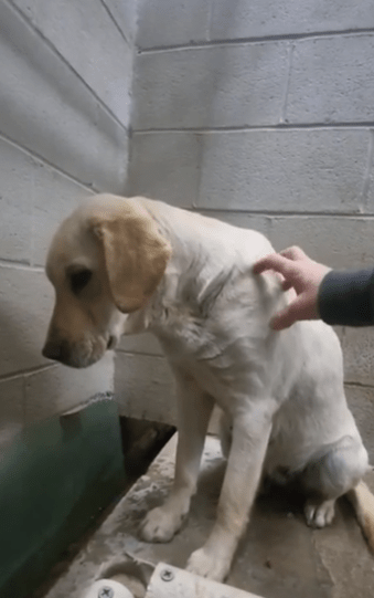 Een vrijwilliger merkte dat Goldie anders reageerde dan de meeste honden. Ze trilde regelmatig en hield haar blik afgewend wanneer iemand dichterbij kwam. Dat stille gedrag raakte haar zichtbaar.