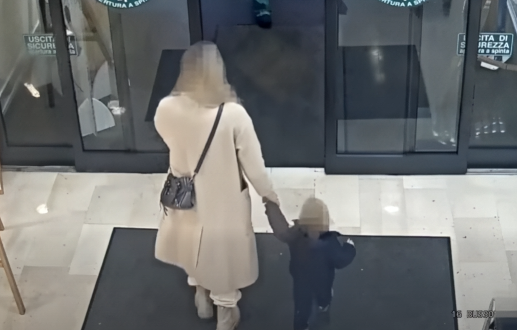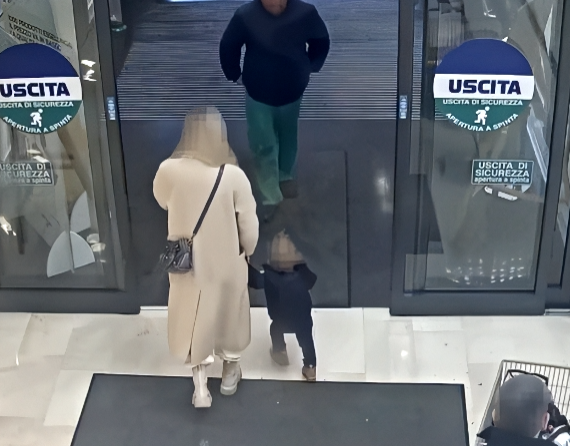 De moeder reageert meteen en trekt haar dochter dichter naar zich toe. Het hele moment speelt zich af vlak bij de uitgang van de supermarkt.