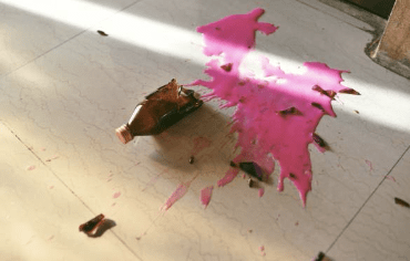 Op de parkeerplaats scheurde een tas, waardoor de fles op de grond viel en kapot ging.