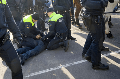 Volgens mensen die de video delen, probeert de persoon de handhaver te bespugen. Dat moment wordt door veel kijkers gezien als het keerpunt in de situatie.
