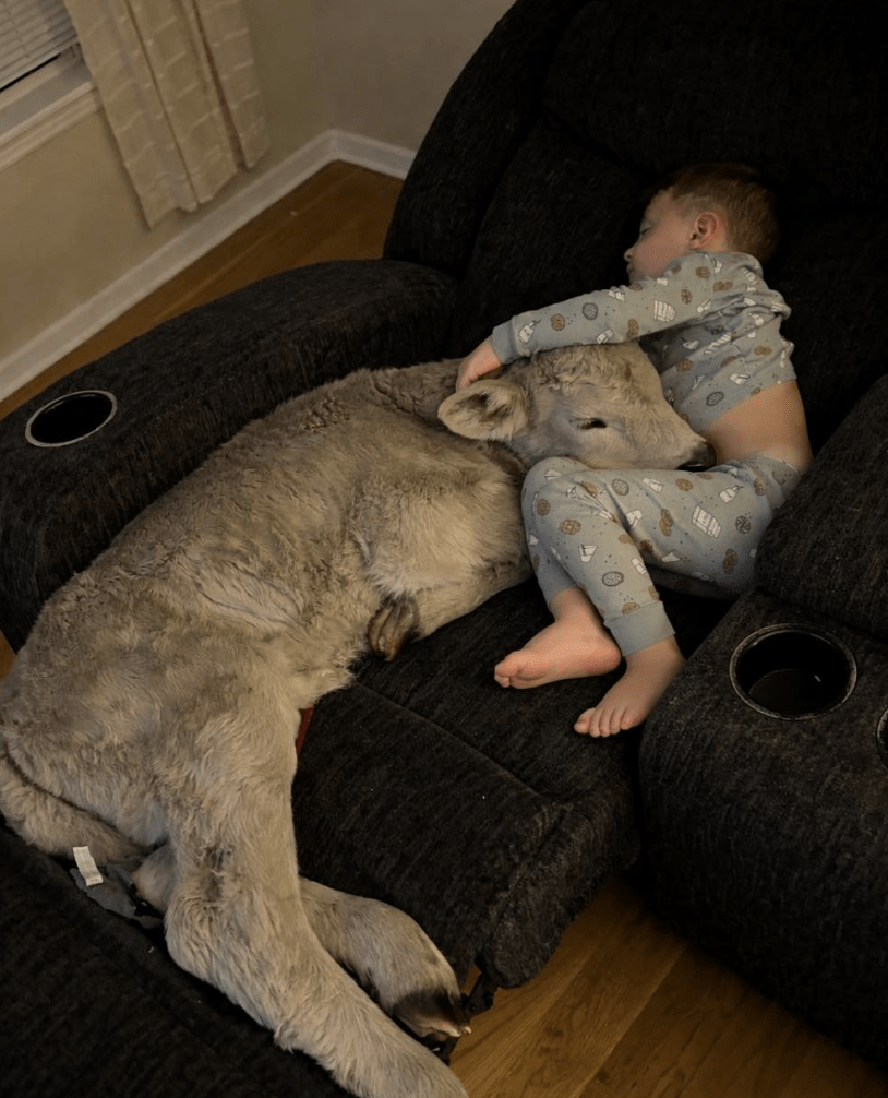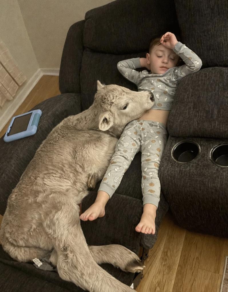 Toen het kalf zich beter voelde, gebeurde iets wat niemand had verwacht. Het dier kroop instinctief richting de kinderen van het gezin, die op de bank lagen te slapen.