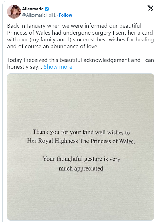 - Persoonlijk Bedankje: Allexmarie, een trouwe fan, ontving een persoonlijke bedankbrief van Kate.