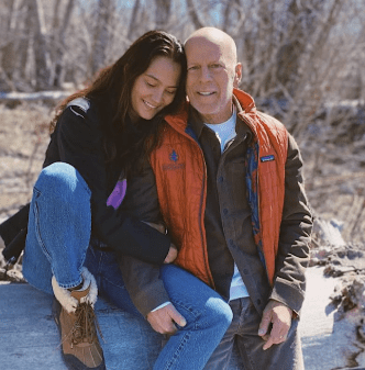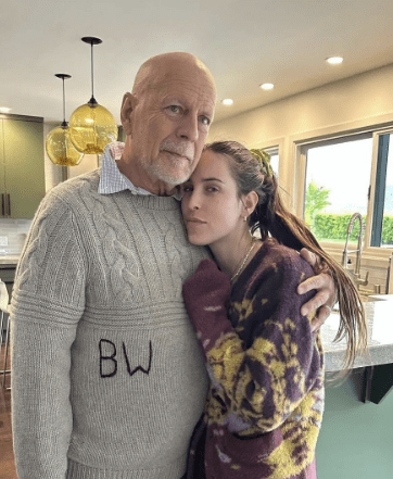 Op de afbeelding zit Bruce dicht tegen hun dochter aan in een rustige woonkamer, waarbij zijn zachte blik en ontspannen houding direct opvalt bij duizenden mensen over de hele wereld en een diep gevoel van ontroerende nabijheid en tederheid oproept.