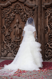 Zonder verder na te denken draaide ze zich om, haar sluier zwiepte mee in de tocht, en ze liep de kerk uit alsof haar benen precies wisten wat ze moesten doen en waarheen ze haar moesten dragen. Buiten voelde de lucht kouder, maar tegelijk ook eerlijker en helderder, alsof ze pas daar weer vrij kon ademen.