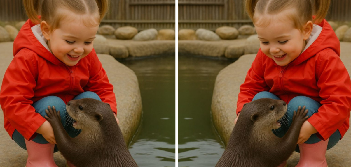 Lieke hurkte voorzichtig neer, strekte haar kleine handje uit en liet het zachtjes over de glanzende vacht van de otter glijden. Het dier bleef rustig zitten, alsof het haar aanwezigheid volledig accepteerde en er plezier aan beleefde.