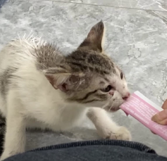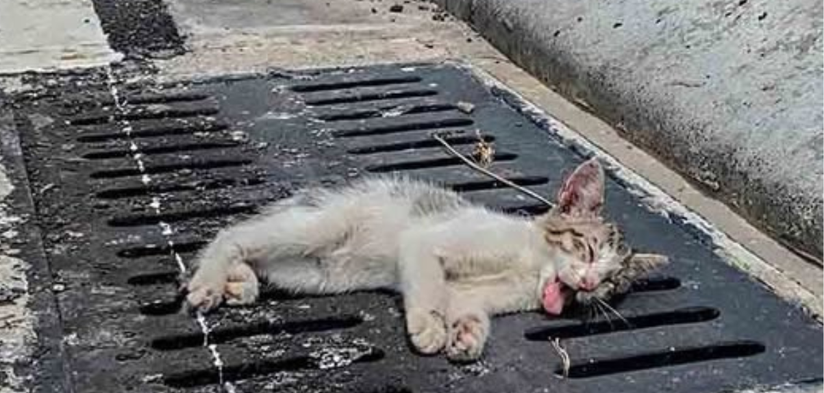 Het kleine katje, dat nog maar nauwelijks kracht had om te bewegen, was duidelijk dorstig en volledig uitgeput. Zijn kleine kopje hing slap omlaag, alsof het te zwaar was om op te tillen. Elke seconde die het daar bleef liggen, betekende minder levensenergie en een groter risico om het niet te overleven. Het arme diertje leek te smachten naar hulp, de angst en hulpeloosheid straalden uit zijn doffe oogjes.