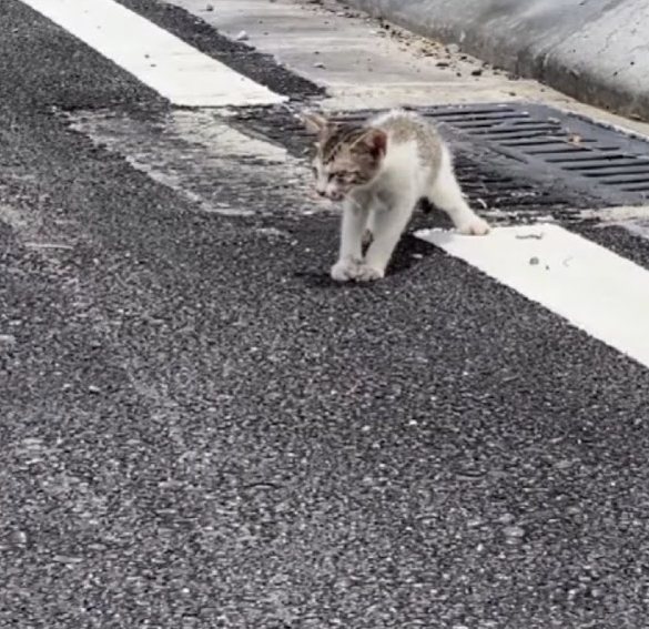 - Een uitgeput kitten werd op het brandend hete asfalt aangetroffen, zichtbaar verzwakt door de aanhoudende hittegolven die het land teisterden en amper nog in staat om zichzelf in veiligheid te brengen.