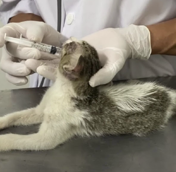 Bij aankomst in de praktijk reageerde het medische team onmiddellijk door het katje vocht toe te dienen via een injectiespuit en meteen zijn lichaamstemperatuur te meten. Uit de meting bleek dat de lichaamstemperatuur van het katje ver boven het veilige niveau lag, waardoor het gevaar van oververhitting werd bevestigd.