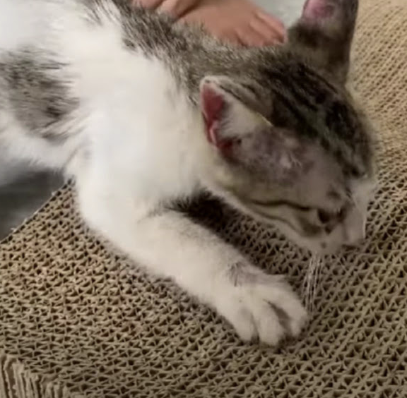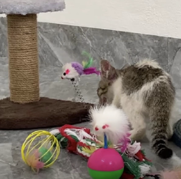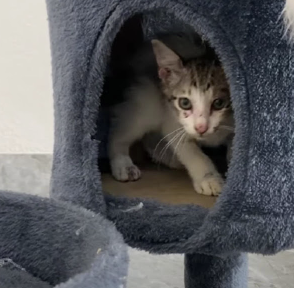 Het kitten, dat inmiddels volledig hersteld is van zijn avontuurlijke en moeilijke start, leeft nu gelukkig in een warm en liefdevol thuis waar hij alle zorg en aandacht krijgt die hij verdient. Hij is speels, nieuwsgierig en geniet zichtbaar van alle liefde en aandacht die hij elke dag ontvangt, wat duidelijk te zien is in zijn vrolijke en levendige gedrag.