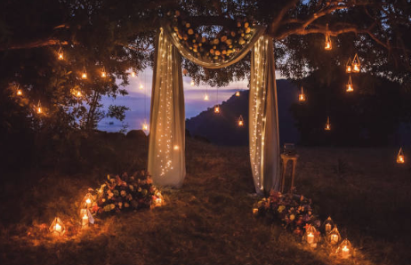 De tuin stond vol warme, flikkerende kaarsen die zacht dansten in de avondwind, terwijl rijen witte bloemen zorgvuldig langs het kronkelende pad waren neergelegd om het geheel een serene en bijna hemelse uitstraling te geven, waardoor de hele omgeving doordrenkt was met een vredige en betoverende sfeer die zowel rustgevend als betoverend was.